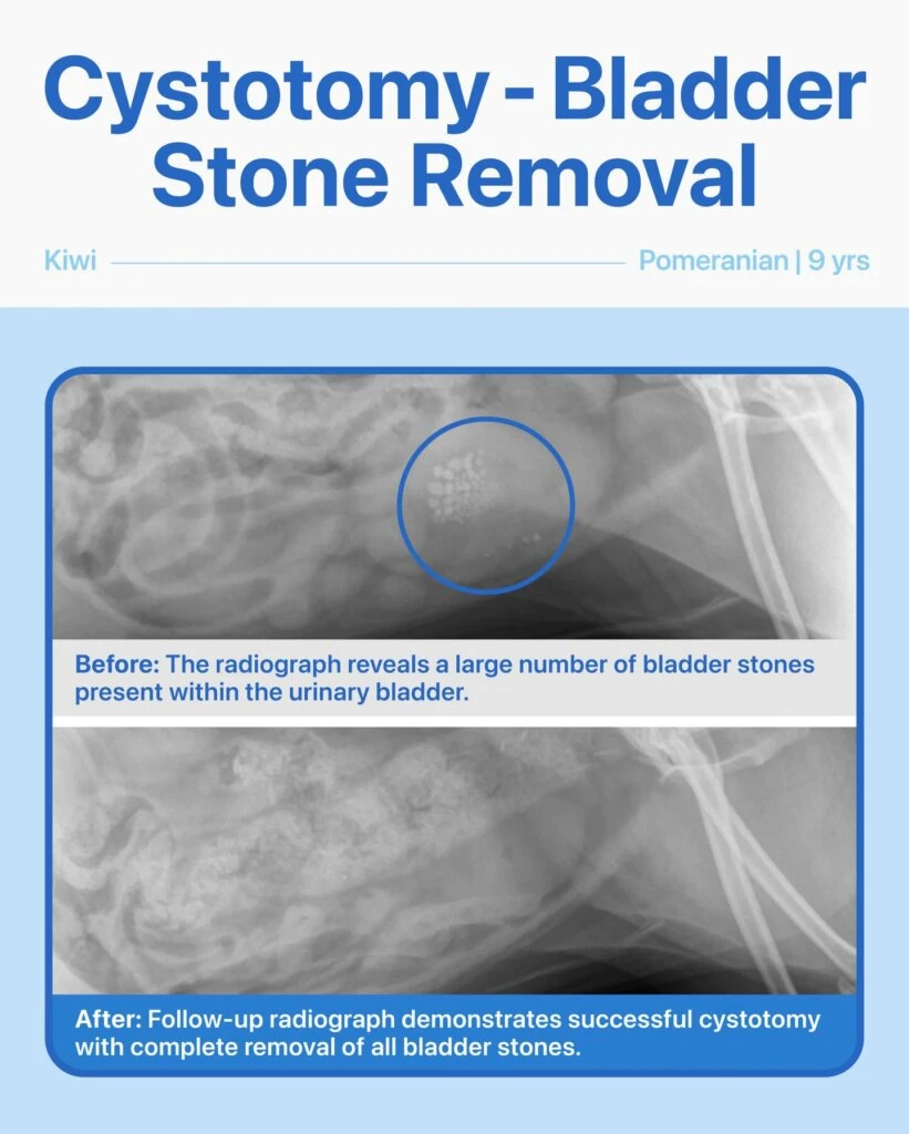 Kiwi, a 9-year-old Pomeranian who came to us for urination issues. His owner noticed dripping after urination, increased thirst, more frequent inappropriate urination, and excessive licking of his private area. After a thorough exam and radiographs, we found multiple bladder stones that needed to be removed as soon as possible