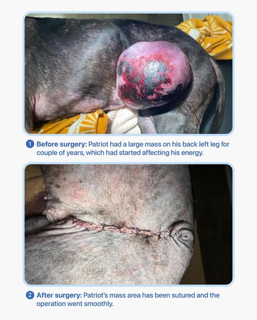 Patriot came to us in rough shape, with a leg mass that had suddenly worsened overnight, causing inflammation and discharge. This 10-year-old American Pit Bull Terrier Mix had a mass that had been present for couple of years, but its rapid growth put him in urgent danger.