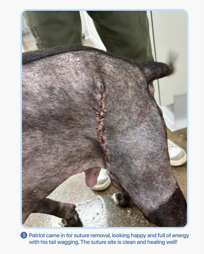 Yesterday, Patriot came in for suture removal—and what a difference! He was happy, energetic, and on the road to full recovery. His suture site is healing beautifully. We’re so proud of Patriot’s strength and resilience!