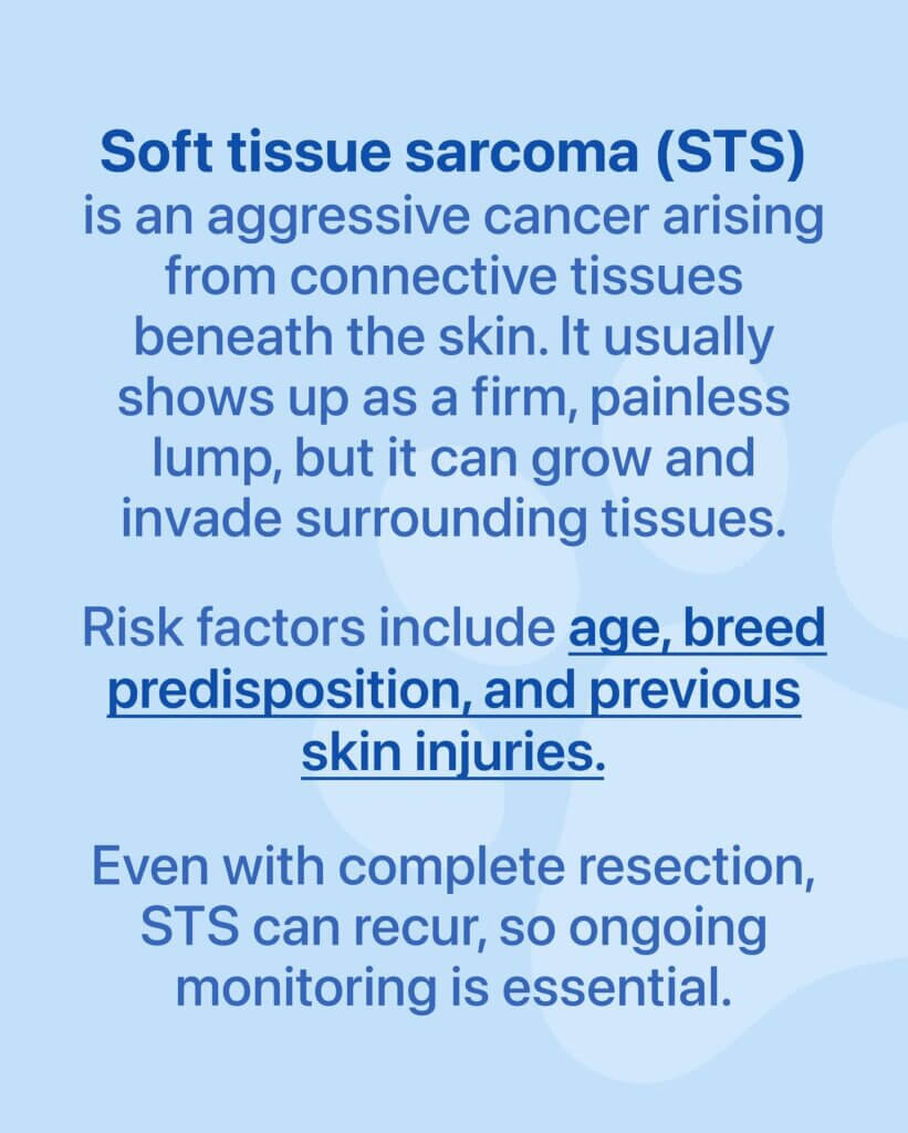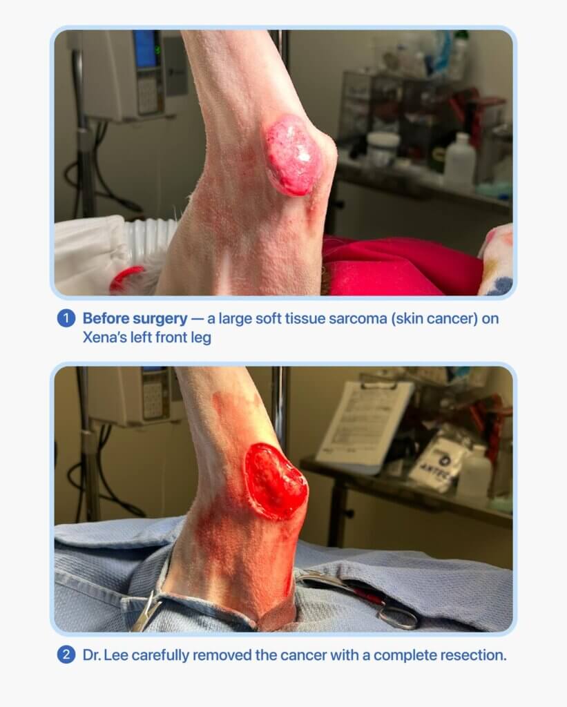 Xena, a 10-year-old Border Collie mix, came in with a large fatty lump on her left front leg. After a thorough exam and cytology, we discovered it was a soft tissue sarcoma (STS) — an aggressive form of skin cancer.