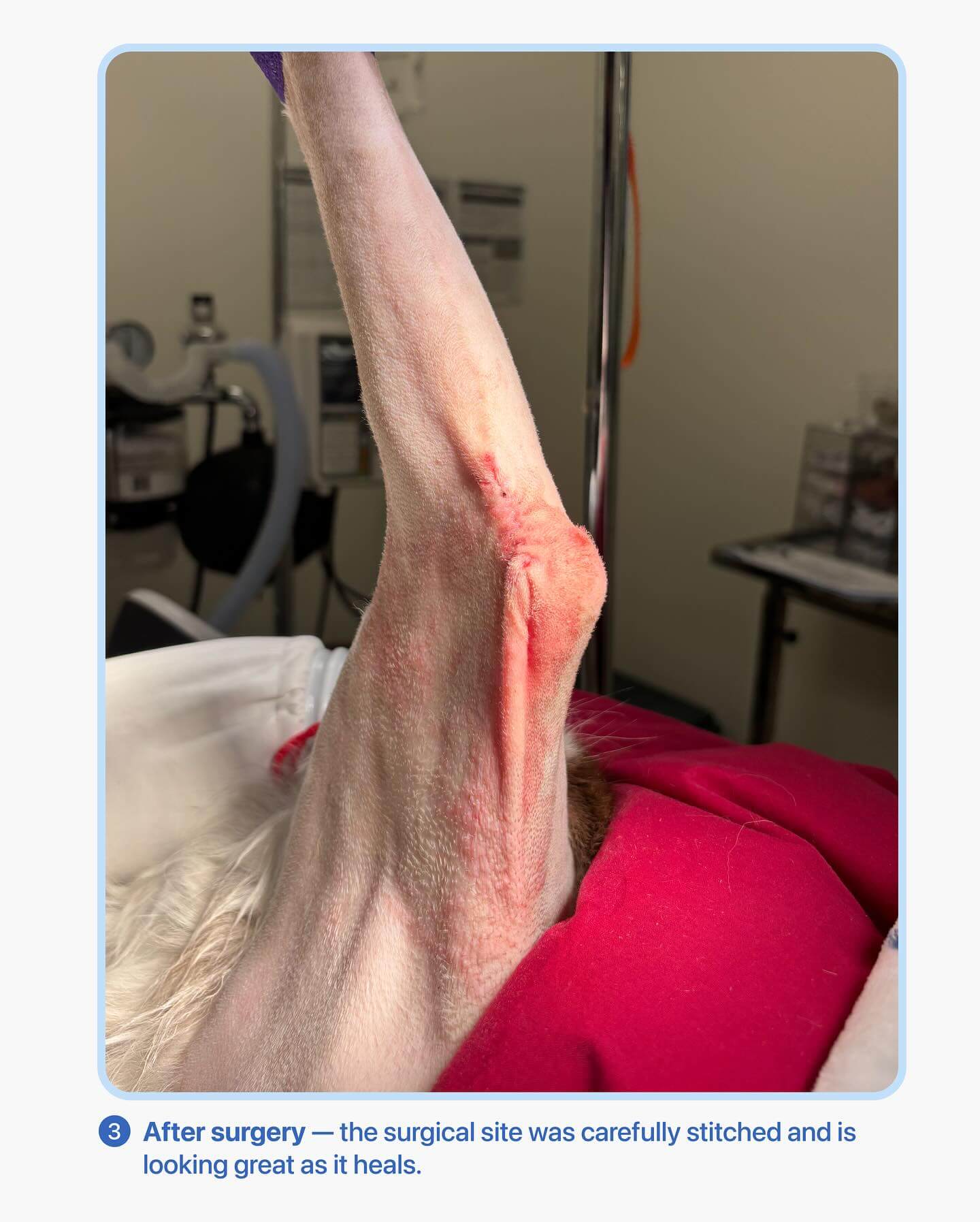 Xena, a 10-year-old Border Collie mix, came in with a large fatty lump on her left front leg. After a thorough exam and cytology, we discovered it was a soft tissue sarcoma (STS) — an aggressive form of skin cancer.