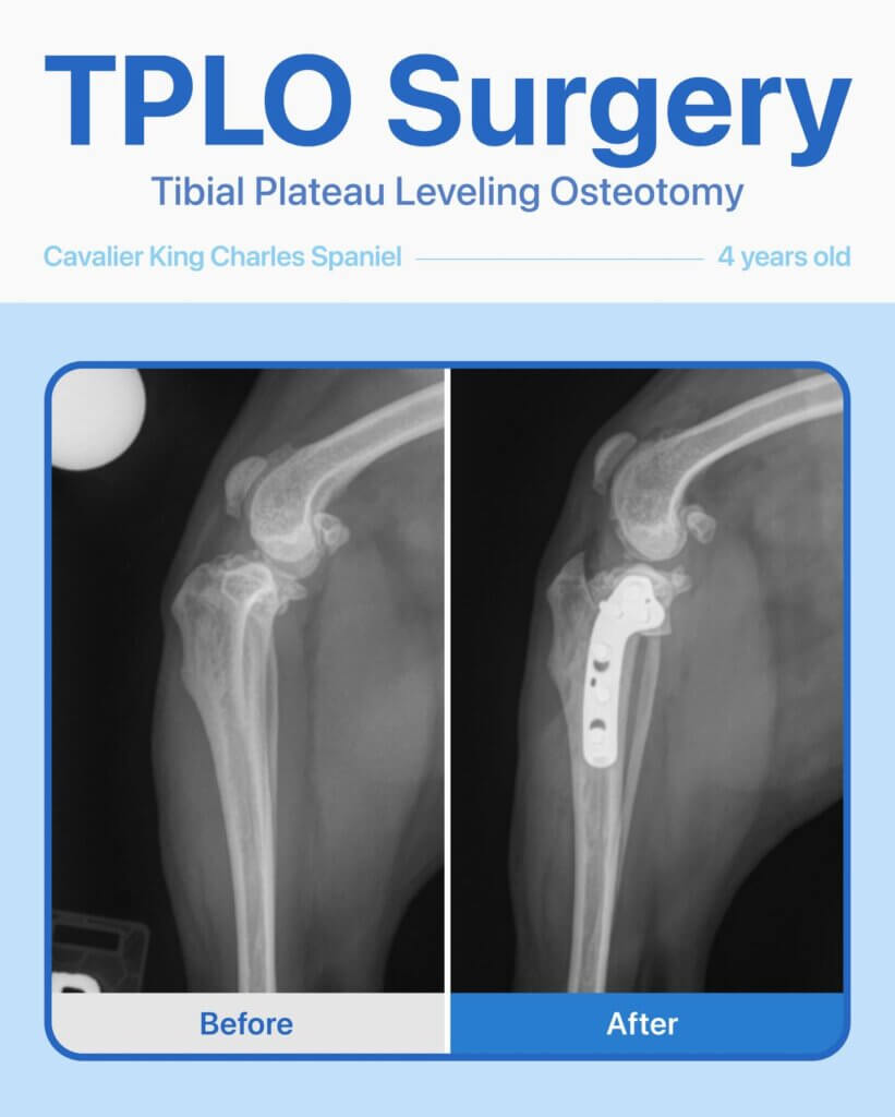 After radiographs, we confirmed a cruciate ligament tear, and she underwent a TPLO surgery.