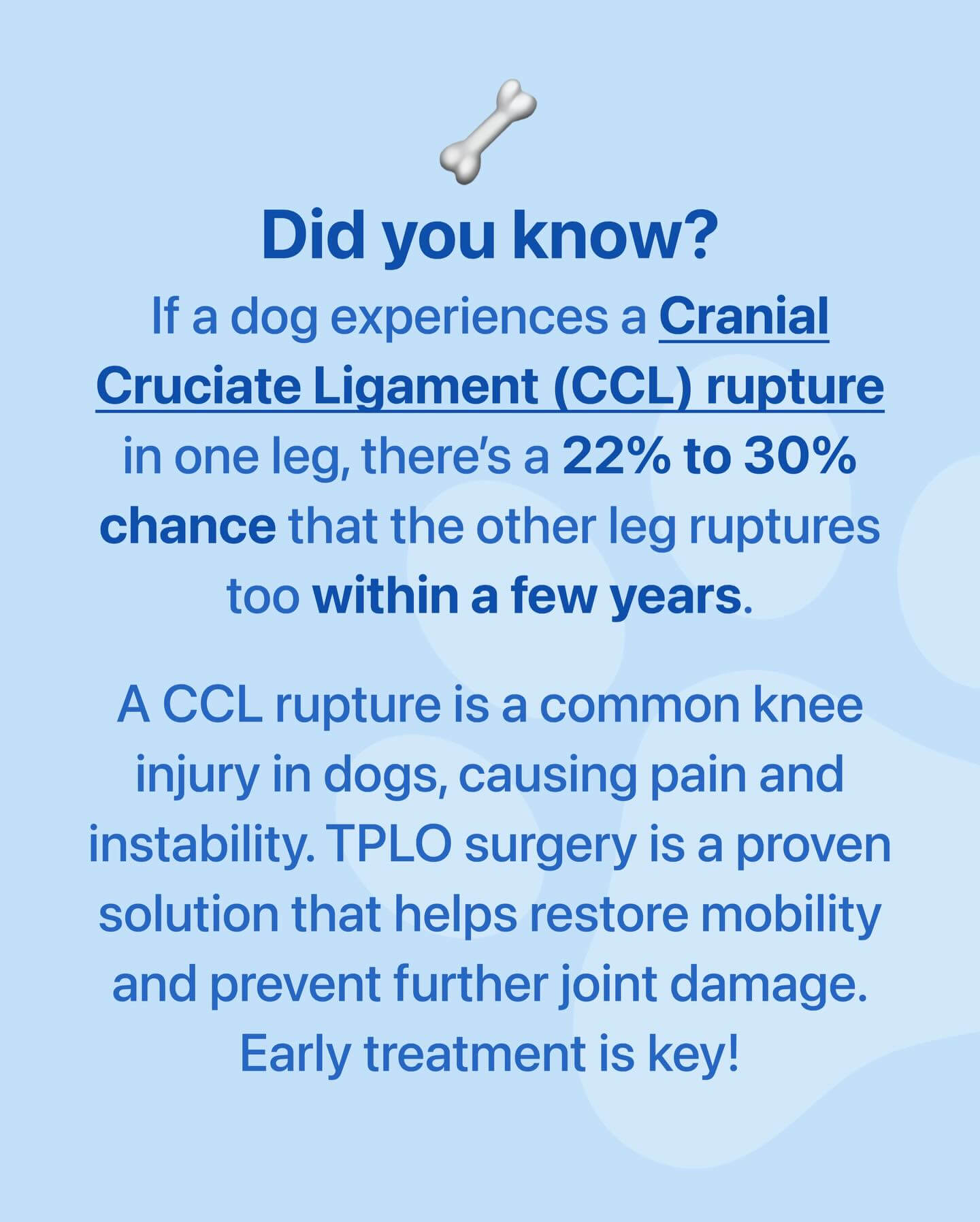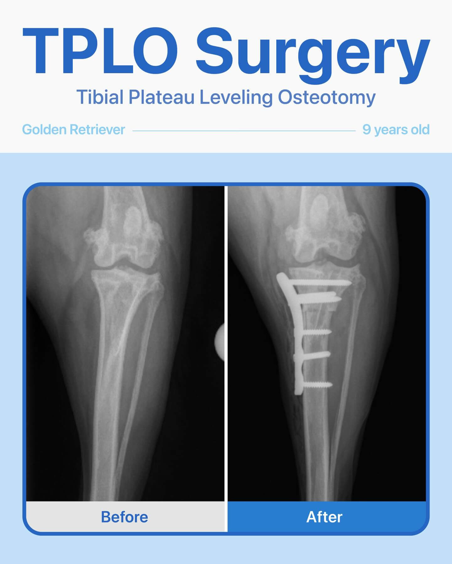 After a thorough orthopedic exam and radiographs, we diagnosed a cranial cruciate ligament tear and recommended TPLO (Tibial Plateau Leveling Osteotomy) surgery to restore stability and comfort.