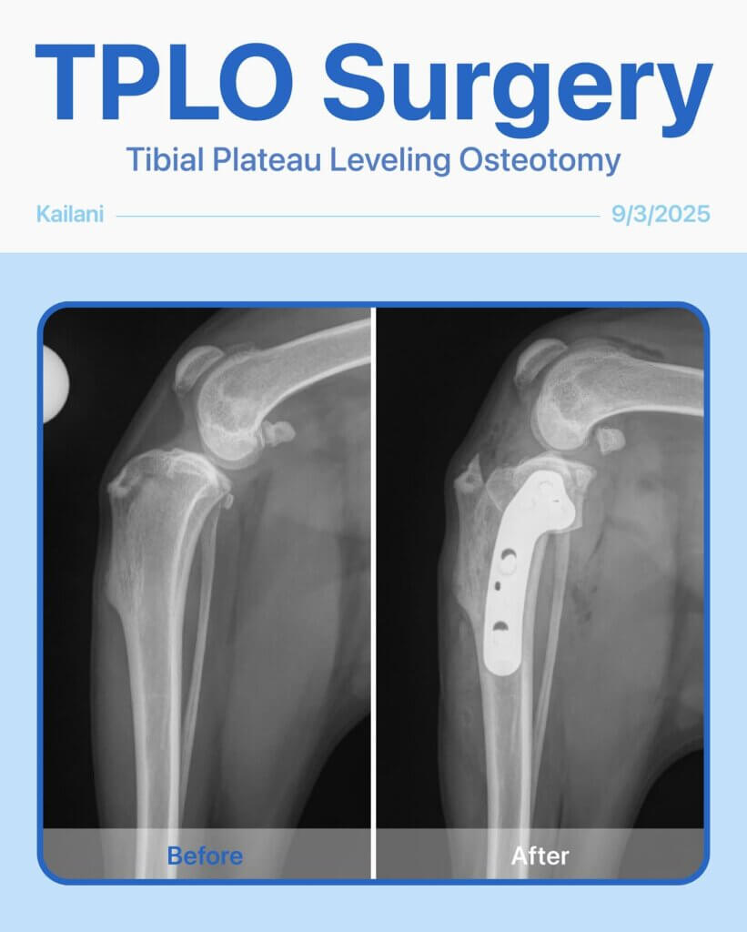 The surgery went beautifully, and Kailani is already showing signs of progress! Each day brings stronger steps, wagging tails, and brighter adventures ahead. We’re so proud of her resilience—and we’ll be with her every step of the way!
