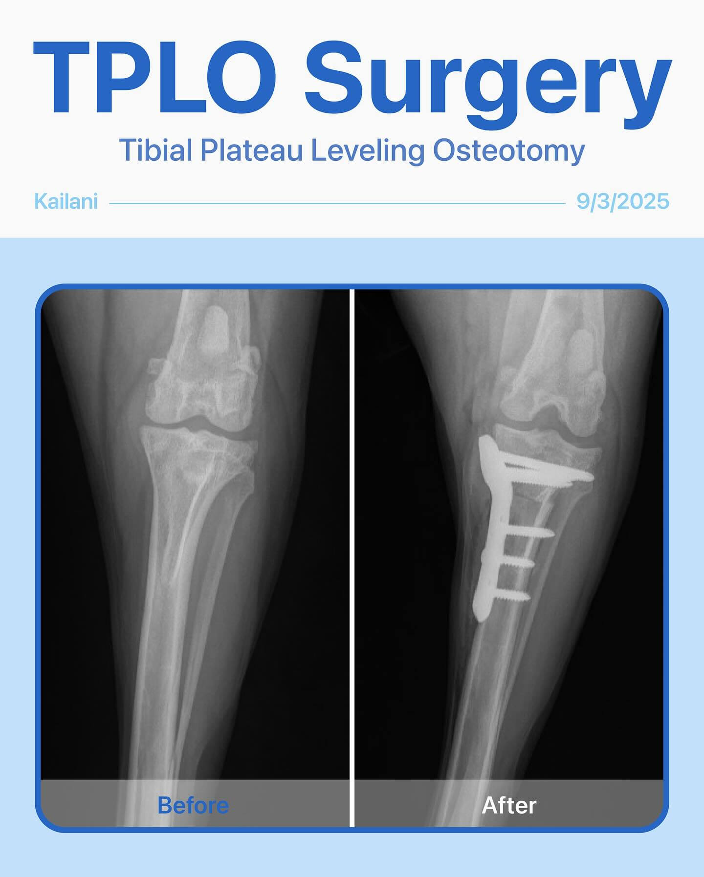 The surgery went beautifully, and Kailani is already showing signs of progress! Each day brings stronger steps, wagging tails, and brighter adventures ahead. We’re so proud of her resilience—and we’ll be with her every step of the way!