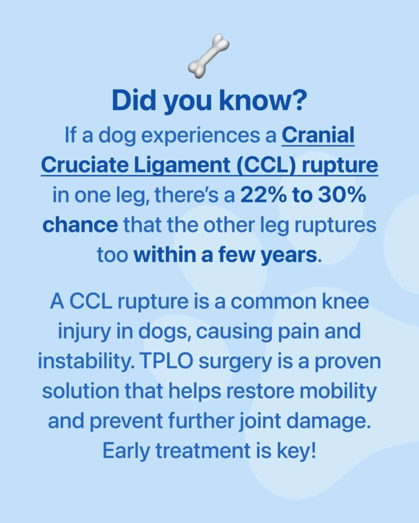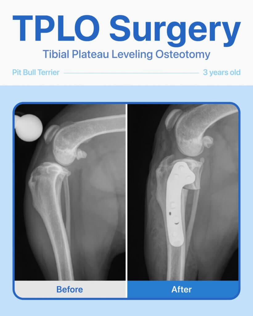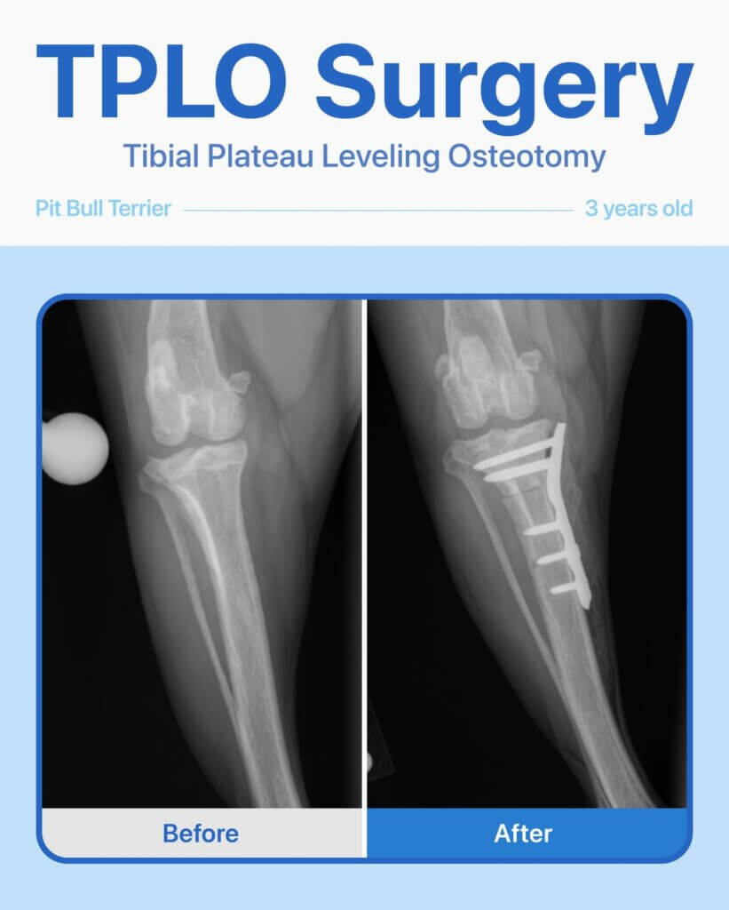 We recommended and performed TPLO surgery to stabilize her knee. Thanks to careful surgical technique and post-op care, she has made an amazing recovery — walking comfortably, running, and playing pain-free!