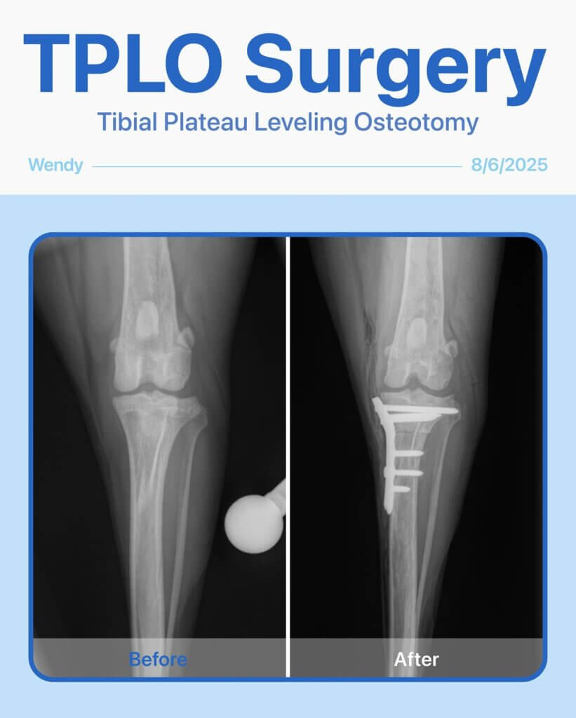 Did you know? Dogs who experience a Cranial Cruciate Ligament (CCL) rupture in one leg have a 22–30% chance of the other leg rupturing within a few years. Wendy’s case is a reminder that even the strongest pups sometimes need a little extra care.