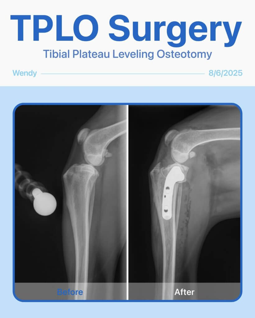 Stronger Than Ever: Wendy’s Story. Last year, Wendy, our brave 7-year-old English Shepherd, had a TPLO surgery on her back left leg. Recently, her back right leg started limping, and after a careful exam, we found that she needed another TPLO surgery.