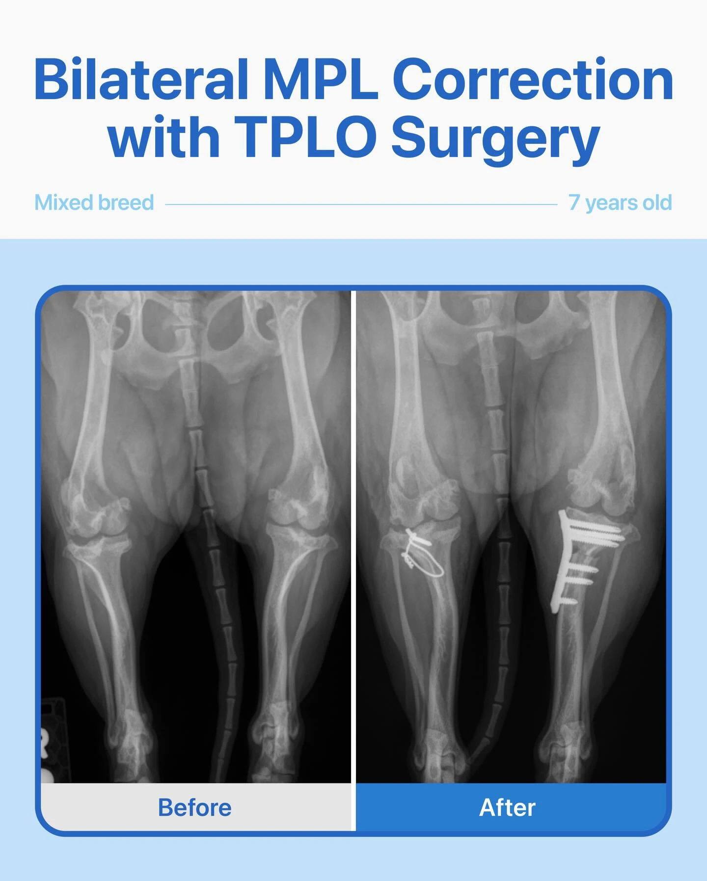 Six months of limping led this 7-year-old mixed-breed dog to our hospital Her owner noticed the limping had been getting worse, and she would make a squeaking sound when being lifted, so we performed radiographs for a closer look. We discovered that both kneecaps were slipping out of place, along with a cranial cruciate ligament injury in … Read moreMedial Patellar Luxation AND TPLO – Mixed Breed